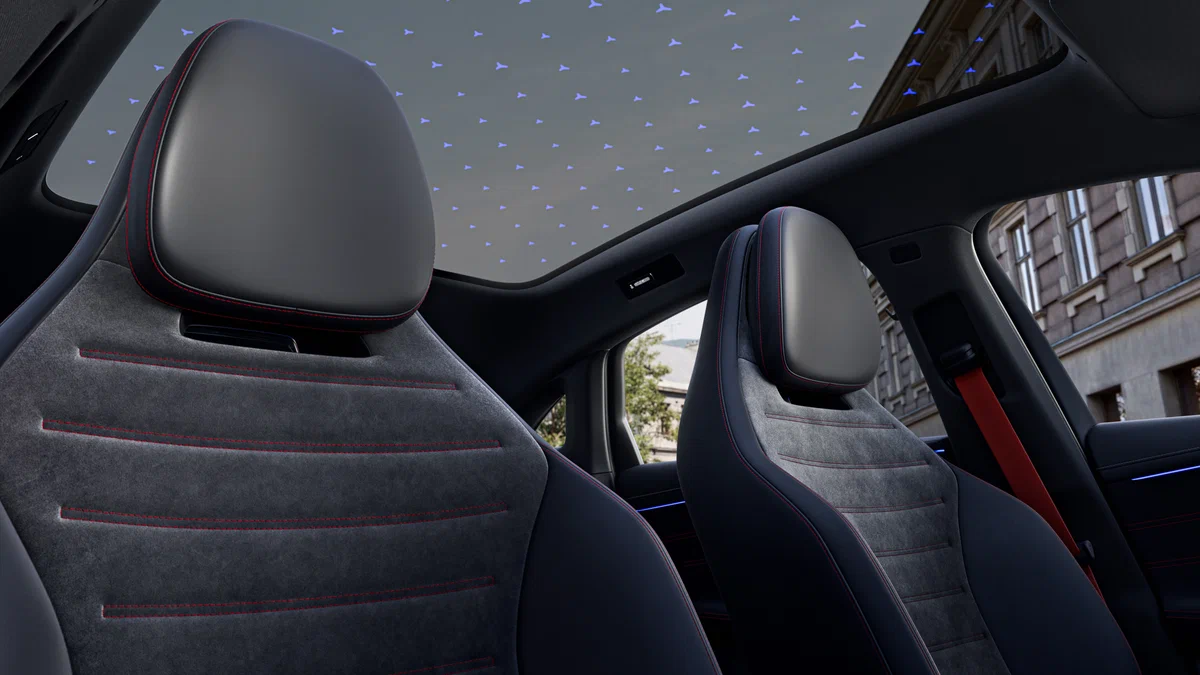 Також можна припустити, що на перших зображеннях електричний C-клас показаний із опціями від AMG — на це вказують форма керма, крісла з посиленою боковою підтримкою та інтегрованими підголівниками, а також оздоблення в чорно-червоних тонах із використанням алькантари. Сидіння отримають розширені можливості регулювання, включно з чотирипозиційною поперековою підтримкою, масажем і вентиляцією.