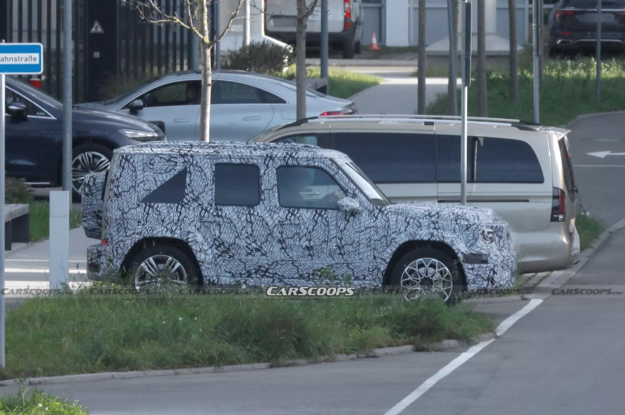 Тестовий прототип ретельно «упакований» у камуфляж, однак уже зараз помітно, що новинка виглядатиме практично так само, як і повноцінний Гелендваген — з поправкою на розміри. На деяких фото, де baby-G зафіксований поруч із серійними моделями Mercedes-Benz, можна оцінити його габарити.
