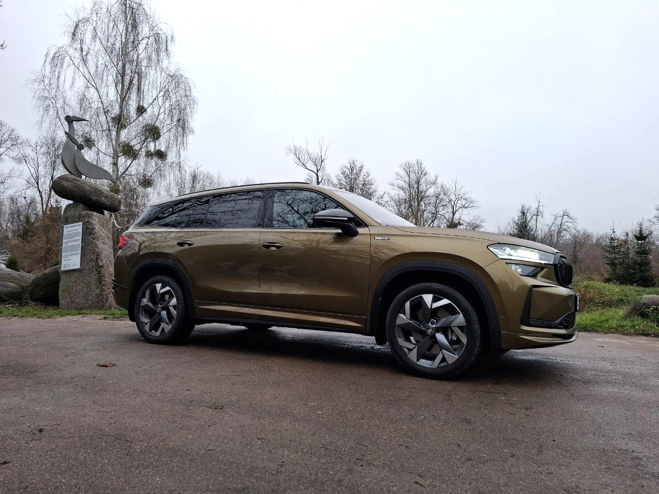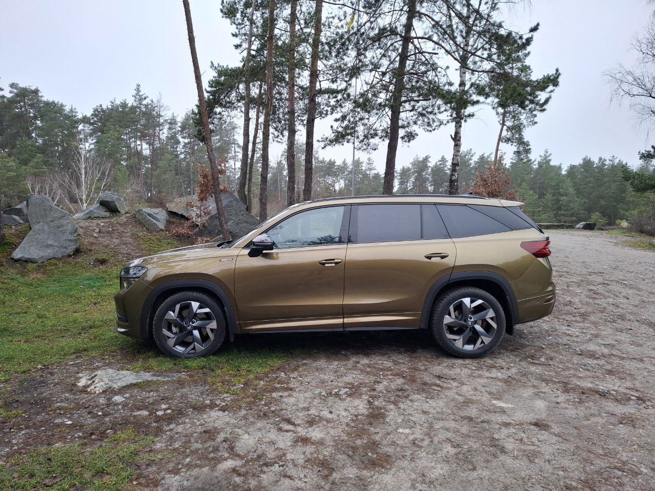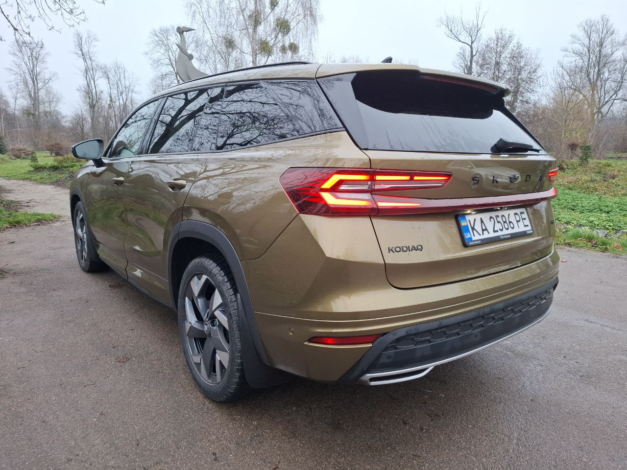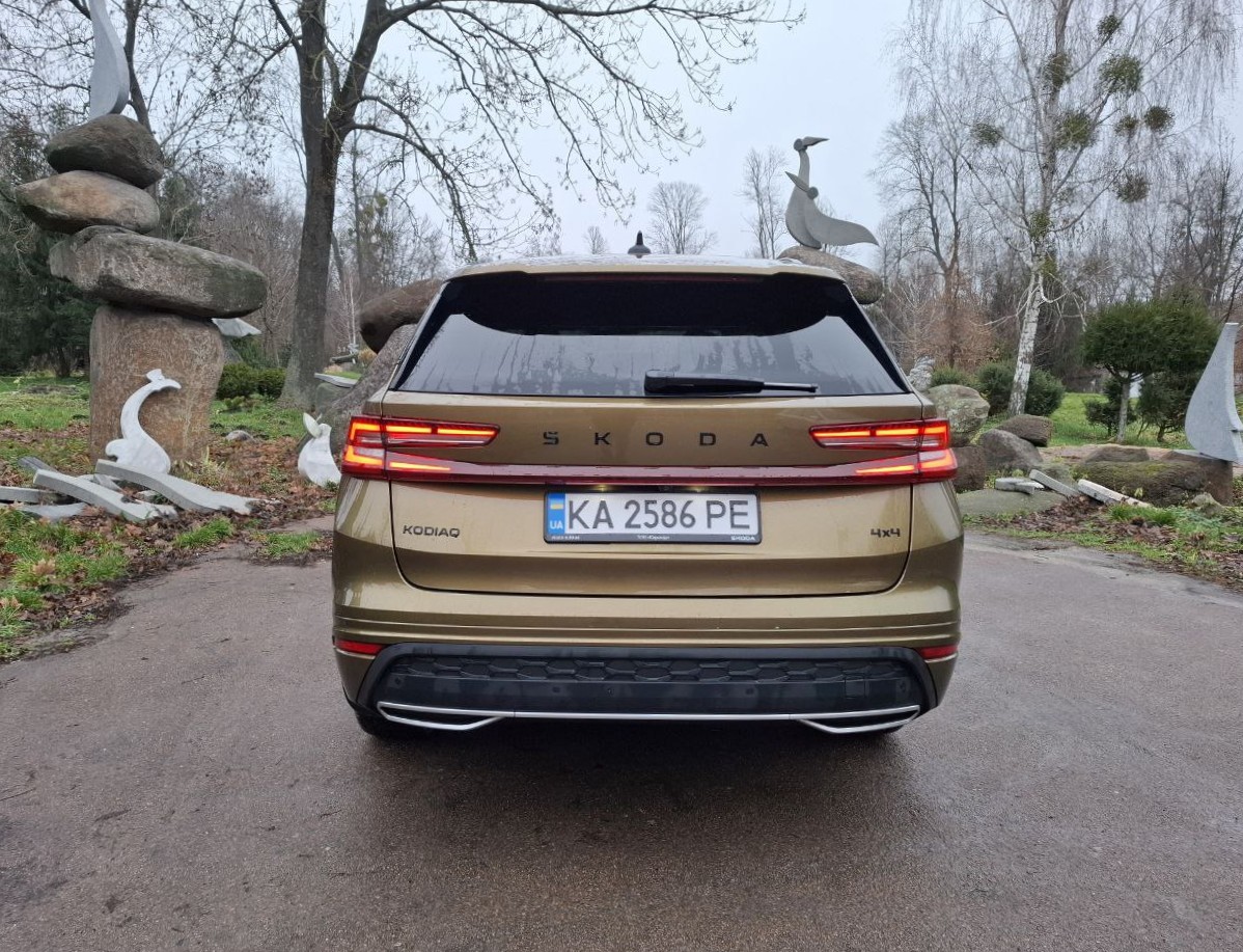 Задня частина стала візуально ширшою завдяки тонким ліхтарям, з’єднаним світловою смугою. У Sportline додається більше глянцево-чорних акцентів, інші бампери та 19-дюймові колеса, які добре заповнюють колісні арки. У підсумку Kodiaq виглядає стримано, але вже не нудно — це великий кросовер, який не губиться в потоці.